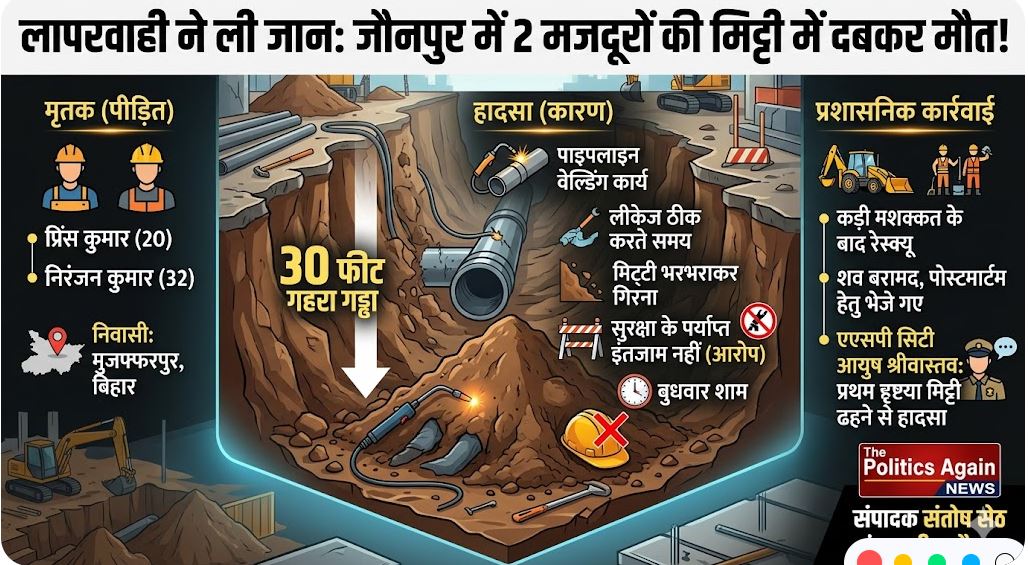 जौनपुर में दर्दनाक हादसा: 30 फीट गहरे गड्ढे में मिट्टी धंसने से 2 मजदूरों की दबकर मौत, पाइपलाइन का कर…