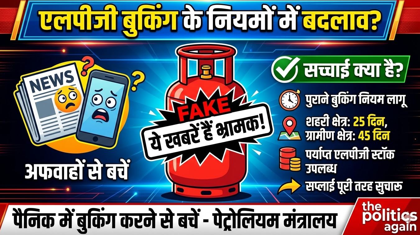 “सोशल मीडिया पर एलपीजी सिलेंडर की बुकिंग समयसीमा में बदलाव की खबरों को पेट्रोलियम मंत्रालय ने पूरी तरह भ्रामक और गलत बताया है। सरकार ने स्पष्ट किया है कि बुकिंग के पुराने नियम ही लागू रहेंगे (शहरी क्षेत्रों में 25 दिन और ग्रामीण क्षेत्रों में 45 दिन)। देश में एलपीजी का पर्याप्त स्टॉक है, इसलिए घबराहट में गैस की बुकिंग न करें”